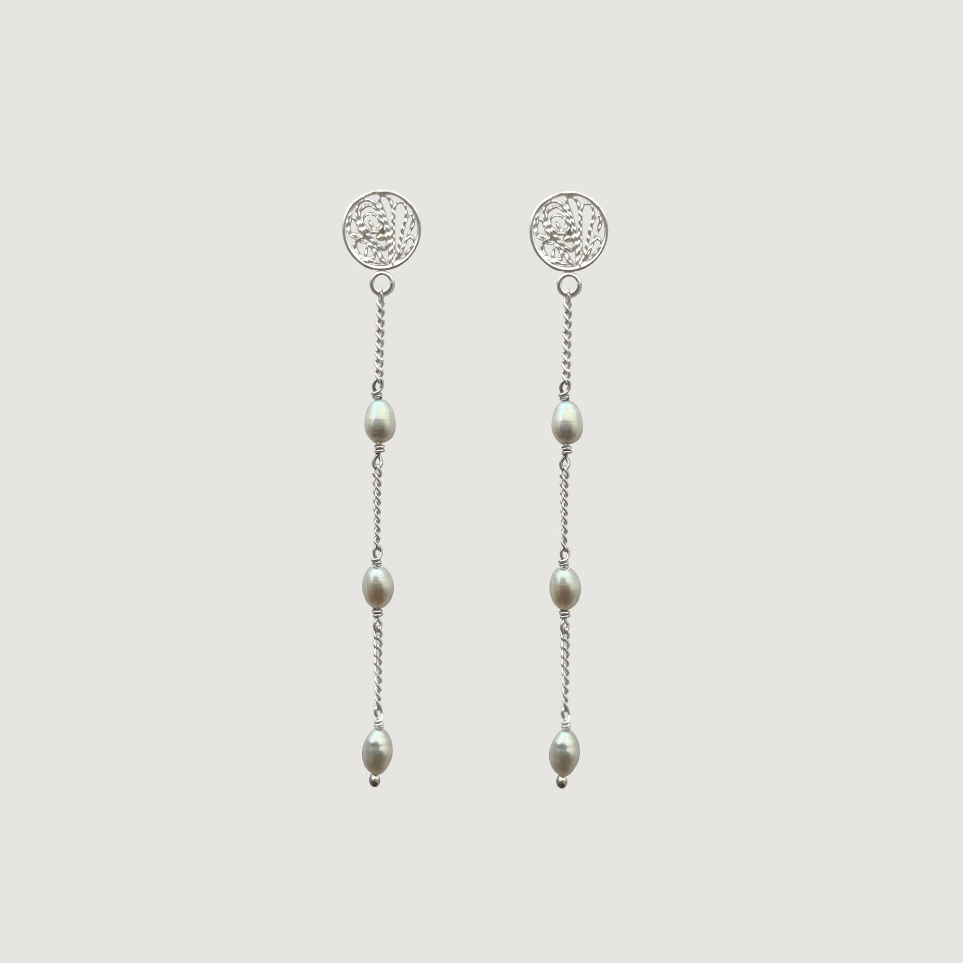 Aretes de filigrana con cadena largos de plata.925 y perlas naturales